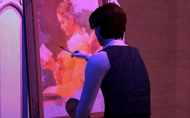 I've never understood the painting animation. The sim drops down a few random lines, then an image starts to blossom on the canvas. It's like the sim is growing a painting.